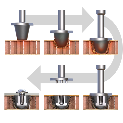 The EJOT TSSD® ("Thermischer Stoffschlussdom" = thermal adhesive bonding boss) product and corresponding joining process have been developed with the objective to join components of which one (preferably the top layer) is made of fibre-reinforced plastics. The process is suitable for sandwich elements with honeycomb and foam core structures (with different top layers) as well as for CFRP and GFRP materials. During the joining process, the plastic boss (made of thermoplastic) is installed into the plastic component with a certain rotation speed and axial load. The EJOT TSSD® Aero was developed on the basis of the TSSD® standard, but with the target of achieving aerospace conformance in terms of strength and material properties.